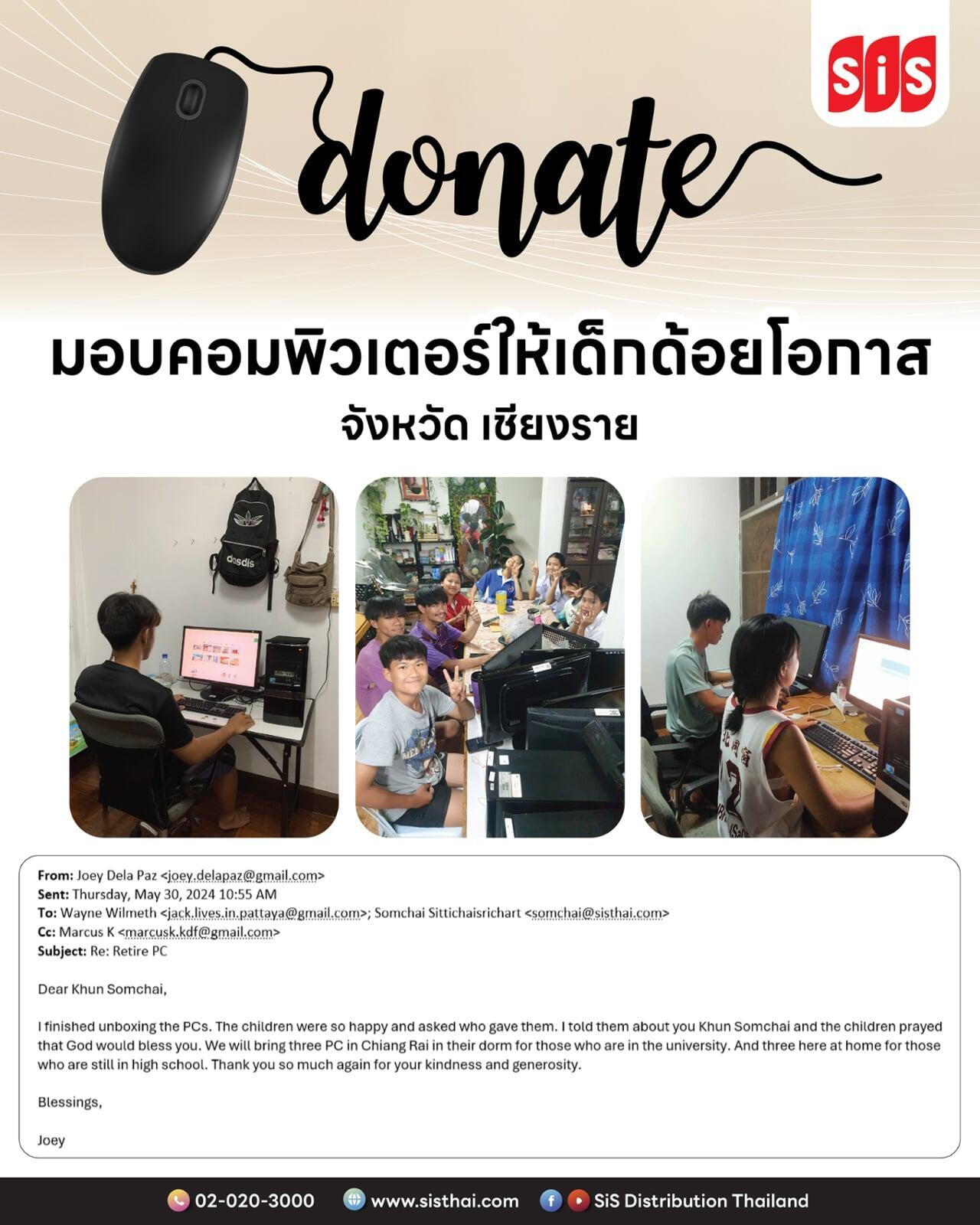 คุณสมชัย สิทธิชัยศรีชาติ กรรมการผู้จัดการ บมจ. เอสไอเอส ดิสทริบิวชั่น (ประเทศไทย) มอบคอมพิวเตอร์ที่ครบอายุการใช้งานในองค์กร ซึ่งยังสามารถใช้งานได้ดี จำนวน 6 เครื่อง ให้กับเด็ก ๆ ด้อยโอกาสใน จ.เชียงราย เพื่อส่งเสริมให้เด็ก ๆ ได้ใช้คอมพิวเตอร์ในการสืบค้นองค์ความรู้นอกเหนือจากในห้องเรียน และใช้สำหรับทำการบ้านและทำงานที่ได้รับมอบหมายจากโรงเรียน