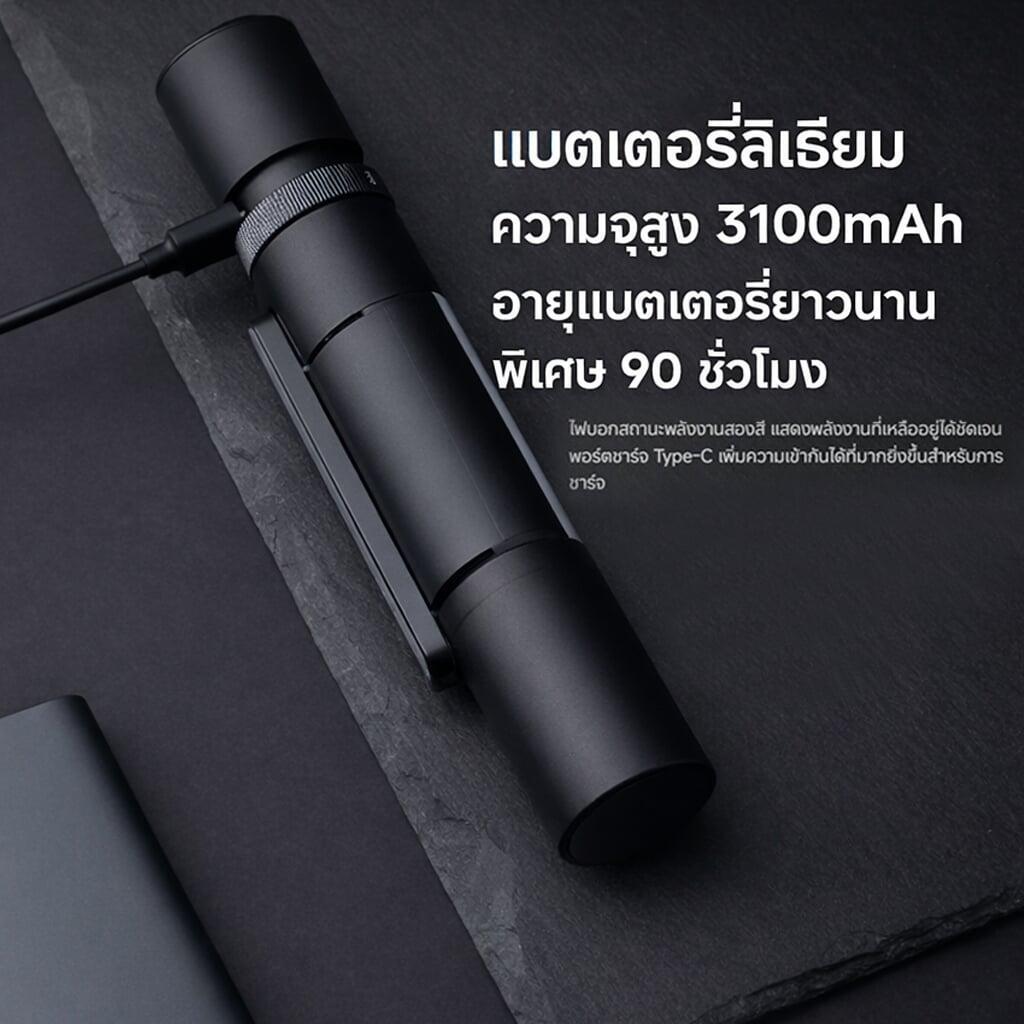 แบตเตอรี่ลิเธียม 3100mAh ใช้งานได้นานสูงสุด 90 ชั่วโมง มีพอร์ตชาร์จ USB Type-C พร้อมไฟแสดงสถานะแบต 2 สี รู้ทันทีเมื่อแบตใกล้หมด